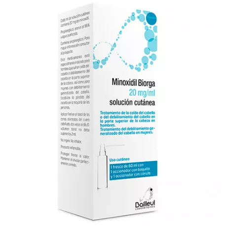 Minoxidil Biorga 20 mg/ml es un medicamento en forma líquida previsto para la aplicación directa sobre el cuero cabelludo. Se utiliza como tratamiento para la caída del cabello y no como cura. El minoxidil es un vasodilatador periférico del que se desconoce el mecanismo exacto mediante el cual renueva el crecimiento del cabello.